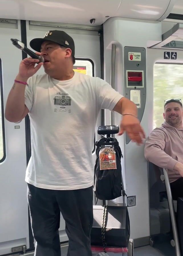 - "The interior of a train car is captured in this shot, showing a man standing and performing with a microphone" by FM-T5EOT2, licensed under CC BY 4.0
