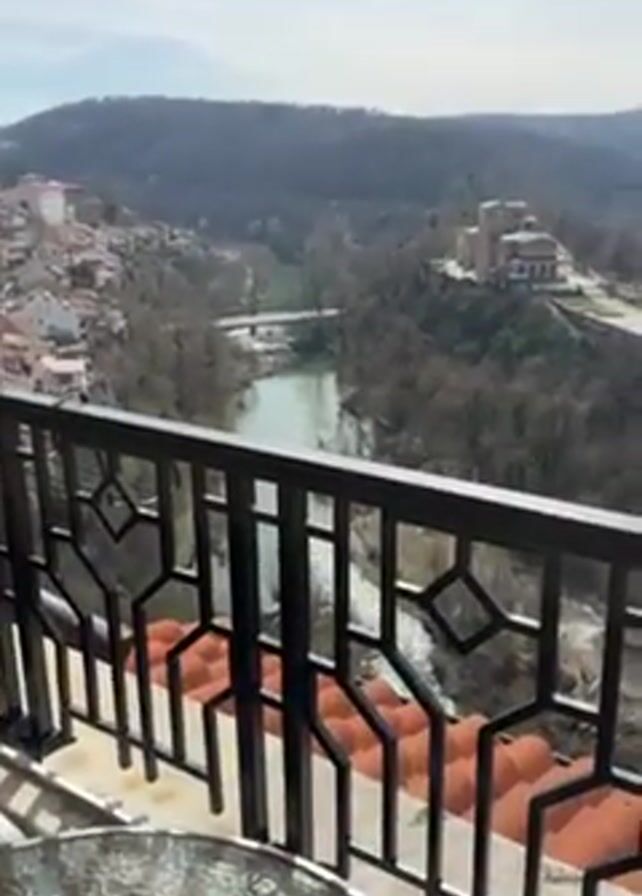 view from a balcony overlooking a scenic landscape with a river and buildings. The balcony has a black metal railing with a geometric design, and a glass-topped table with some small items on it. The landscape features a winding river, trees, and buildings in the distance. The video pans across the landscape, showing a variety of structures and the surrounding natural environment. In the final scene, a person wearing a black outfit and white sneakers is seen cleaning a window on the balcony with a squeegee and spray bottle. There is a patio heater nearby.