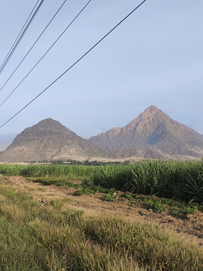 The image depicts an expansive outdoor landscape in the Laredo district of Peru, characterized by agricultural fields and prominent mountains under a clear sky. In the foreground, dry, light brown earth with patches of wild, light green to tan grasses and low-lying vegetation occupies the lower third. A distinct dirt path or track traverses horizontally, separating the foreground grasses from a cultivated field. The midground features a dense field of tall, vibrant green crops, consistent with sugarcane, extending across the scene. Beyond this field, at the base of the mountains, a narrow strip of lighter, sandy terrain and some sparse green foliage are visible. The background is dominated by two large, barren, rocky mountains. The mountain on the left is darker, greyish-brown, with a rounded conical shape and visible horizontal strata. The mountain on the right is lighter, reddish-brown, with a sharper, more angular peak and visible rock formations. Additional, less distinct mountain ranges recede into the distance between and behind these primary peaks. The sky above is a clear, light blue, occupying the upper third of the frame. Five dark, thin lines, identified as overhead power lines or utility cables, diagonally cross the top left quadrant of the image. No people or human activity are discernible.