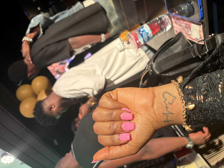 The image depicts an indoor scene in Gwarinpa, Nigeria. In the immediate foreground, a dark-skinned hand with bright pink nail polish is prominently featured, displaying a gold-colored charm bracelet on the wrist. A tattoo depicting an ECG heartbeat line terminating in a heart symbol is visible on the wrist. The arm is covered by a black lace sleeve. In the midground, a group of individuals is present in a dimly lit setting. One male subject, with a dark fade haircut and beard, wearing a white t-shirt and an earring in his left ear, is looking downwards. Another male subject, viewed from the back, wears a black t-shirt, a dark baseball cap, and a silver-colored watch on his left wrist, with a light blue denim jacket draped over his shoulders. His arm is around another partially obscured individual. A third male subject is partially visible on the far left, wearing a black t-shirt. On a surface in the midground, a clear plastic bottle of Miyare brand water with a red cap, a blue-cased smartphone, and several folded pink-colored Nigerian Naira notes are observed. A black bag is also resting on this surface. Above the individuals, a cluster of golden balloons is visible against a dark background, indicating a celebratory event. The overall environment suggests an evening social gathering within an indoor venue.