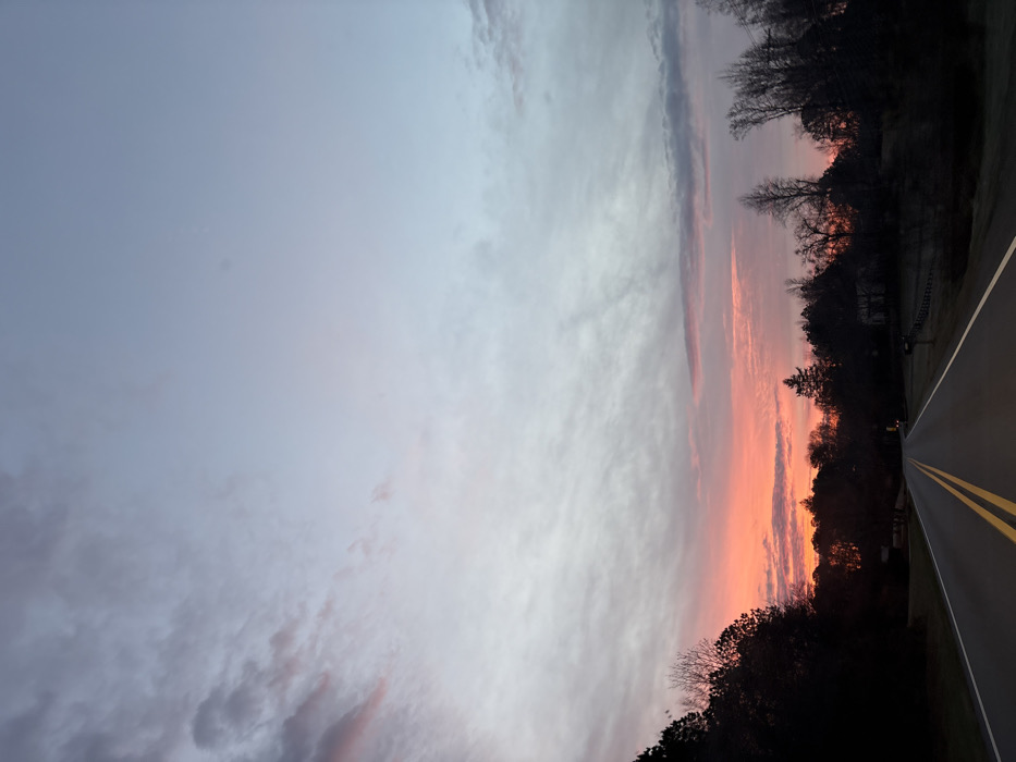 The image depicts a rural or semi-rural road scene in Ball Ground, United States, during twilight. The composition is dominated by a sky displaying a gradient of colors, transitioning from vibrant orange and red at the horizon to pale grey, lavender, and light blue in the upper portions. Scattered clouds are visible, illuminated by the low sun. Below the horizon, a dense, dark silhouette of trees and vegetation spans the width of the frame, with faint outlines of structures discernible within the treeline on the right. A two-lane asphalt road with double solid yellow lines extends from the bottom center of the image towards the distant horizon. Dark, vegetated areas flank both sides of the road. No individuals, vehicles, or specific actions are visible.