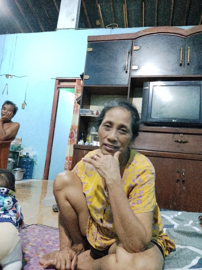An indoor scene in a residence within Kecamatan Pati, Indonesia, displays three individuals and various household objects. In the immediate foreground, an older woman with dark hair and a yellow short-sleeved top with purple patterns sits on a light-colored patterned mat. Her right hand rests under her chin, and a ring is visible on her left ring finger as she looks towards the viewer with a slight smile. To her left, the back of a small child, possibly an infant or toddler, wearing a multi-colored patterned top, is visible on a purple patterned mat. In the background, a man with dark hair, shirtless or wearing a light-colored top, stands near a doorway on the left, looking away from the camera with his right hand near his cheek. The room features light blue painted walls. A dark brown wooden cabinet unit with two upper doors and open shelving occupies the right side of the frame. A black LG television is positioned on a lower shelf of this cabinet, above dark brown drawers. A dark brown door frame is visible on the left, revealing a light green interior space and a partial patterned curtain. Near this doorway, a large blue plastic water dispenser bottle and several metallic containers rest on a light-colored tiled floor. Exposed wooden beams or joists are visible near the ceiling, alongside a silver-colored rectangular duct. Electrical wiring runs along the light blue wall, where an outlet is also present.