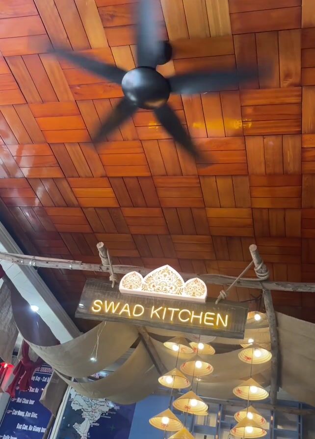 The camera looks up at the ceiling of a restaurant. The ceiling is covered in square wooden tiles. A black ceiling fan with five blades spins rapidly in the center of the frame. Hanging below the fan is a sign that reads "SWAD KITCHEN" in illuminated letters. Above the name are three stylized domes. The sign is suspended by what looks like branches tied together with rope. Hanging below the sign are a series of lamps in the shape of conical Asian straw hats, and a wall of liquor bottles. A man walks below the sign and towards the counter. Behind the counter is a map of Vietnam.