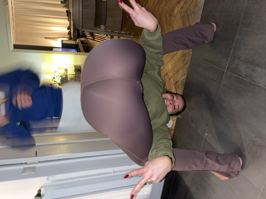 - "A woman wearing brown leggings and a green sweater is upside down, posing with a peace sign" by FM-2aYl13, licensed under CC BY 4.0