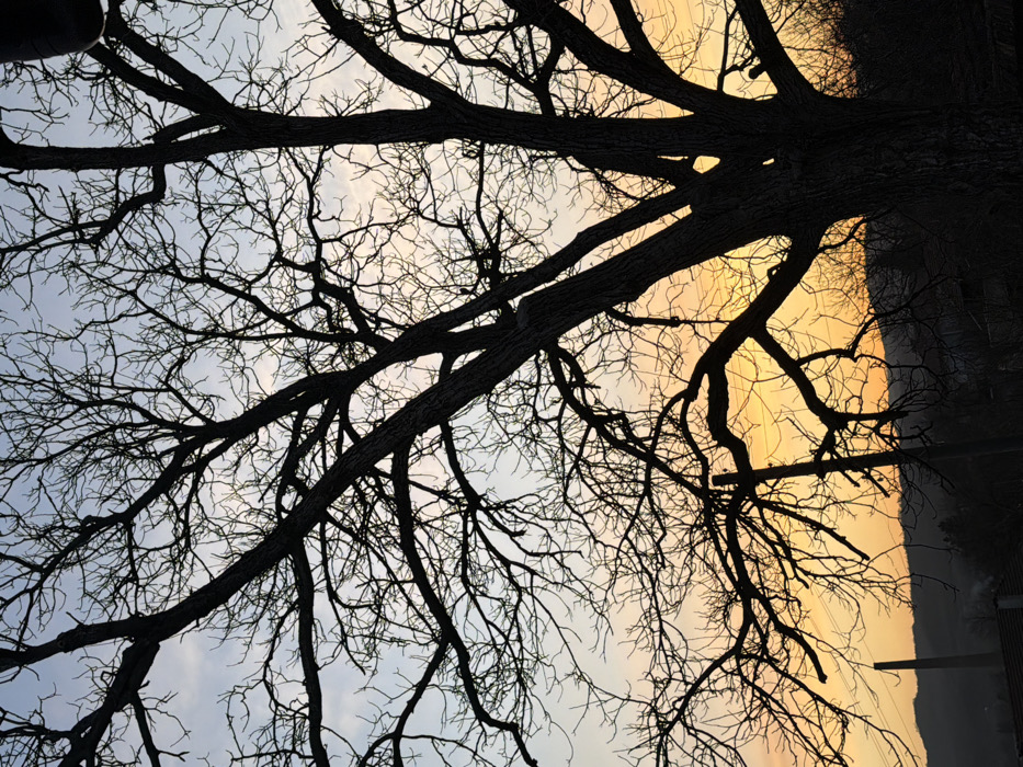 The image presents a naturalistic scene in or near the city of Kilifarevo, Bulgaria, depicting either sunrise or sunset. A large, bare deciduous tree, possibly a walnut, dominates the foreground, silhouetted against a gradient sky. The sky transitions from vibrant orange and yellow hues at the horizon to pale blue and white with faint wisps of clouds in the upper portion. The tree's thick trunk and numerous leafless branches are rendered in dark silhouette, extending across much of the frame. In the midground, a dark utility pole with overhead wires is visible on the left side, partially obscured by the tree's branches. The background reveals the dark silhouettes of undulating hills or mountains along the horizon. Below the horizon, subtle outlines of distant structures are faintly visible, and a prominent, tall, dark cylindrical structure, consistent with a chimney or industrial stack, stands on the far left. No individuals, animals, or specific actions are depicted.