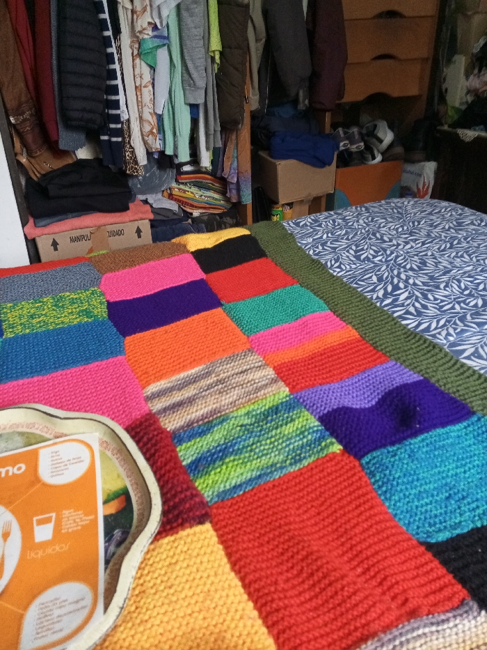 colorful knitted blanket spread out on a bed in a bedroom located at coordinates -31.321, -64.267 in the city of Córdoba, Argentina. The bed has a blue and white floral bedspread. There is a wooden dresser behind the bed, as well as a variety of clothing hanging on a clothes rack. The blanket is made of brightly colored squares, including red, orange, pink, yellow, green, blue, and purple. A large orange and white sign with the word "Liquidos" is visible in the bottom left corner of the image. There is also a large, round, silver plate with food on it. The room is tidy, and there are no people present in the image.
