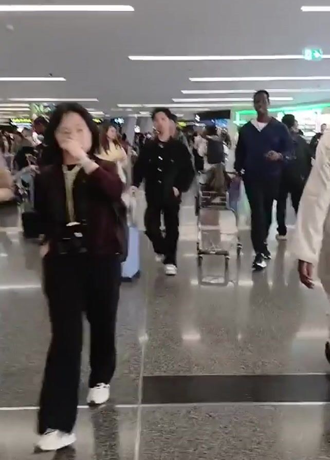busy airport terminal with people walking in different directions. The floor is gray and shiny, and the ceiling has long white lights. Several people are walking with luggage, and there are signs indicating directions. Some people are dressed in traditional clothing, while others are wearing casual outfits. The overall atmosphere is that of a bustling transportation hub.