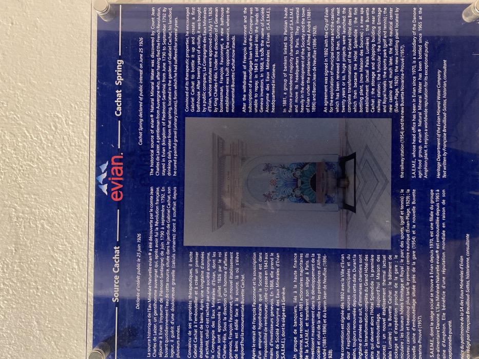 A rectangular, blue informational plaque is prominently displayed on a light-colored wall, secured by two clear circular standoffs in the upper corners. The plaque is titled "Source Cachat" on the left and "Cachat Spring" on the right, with the red "evian." logo centrally positioned at the top. Below the title, text in both French (left column) and English (right column) provides a detailed historical account of the Evian mineral water source. A central image on the plaque depicts a decorative water dispensing structure, presumably the Buvette Cachat in Évian-les-Bains, France. This structure features a classical-style archway or niche, topped with a pediment. Inside the niche, the background is adorned with stylized floral tiles in shades of blue, green, orange, and white. A dark-colored spigot protrudes from the tiled wall, positioned above a semicircular basin. The base of the structure rests on a light-colored, patterned floor with dark grout lines. The overall scene is static, devoid of people or direct action, focusing on the historical information and the iconic water source infrastructure.
