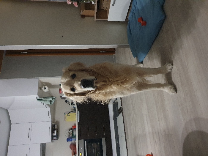 - "A golden retriever stands in a kitchen" by FM-HsUWg2, licensed under CC BY 4.0