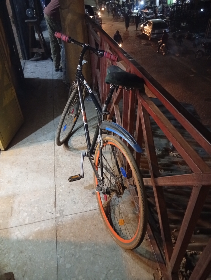 A black bicycle with pink handlebar grips leans against a rusty red metal railing. The bike has orange rims and a blue fender. Beyond the railing is a street scene at night. Cars and motorcycles are visible, as are people walking. The bicycle appears to be parked on a tile surface. The overall lighting is dim, casting shadows on the ground.
