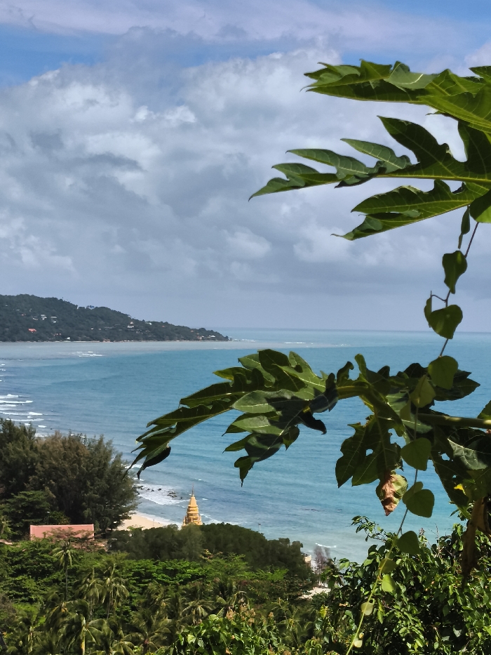 The scene showcases a tropical coastal view framed by lush foliage. Turquoise ocean stretches to the horizon, meeting a cloudy sky. A sandy beach lines the shore, punctuated by a golden pagoda. Green hills rise in the distance. In the foreground, broad, deeply lobed leaves create a natural frame, adding depth to the image. The overall impression is one of serene beauty and tropical charm.
