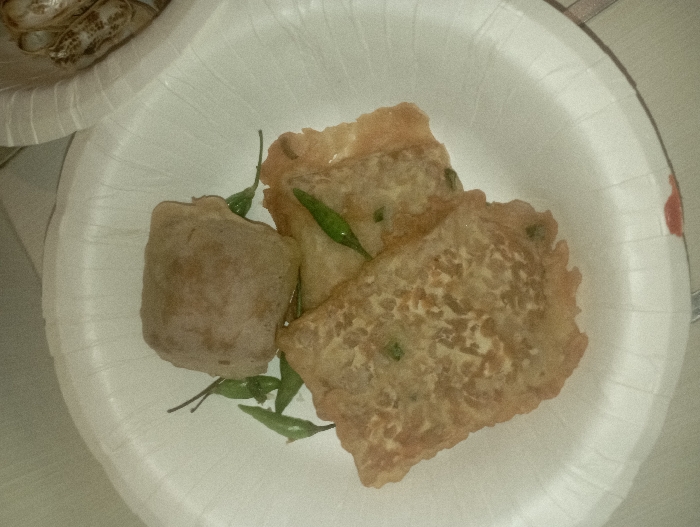 A static, top-down image captures a white, fluted paper plate centered on a light-colored surface, likely a table or countertop. The plate contains an arrangement of fried food items and scattered green chili peppers. One roughly cuboid, pale brown fried item is positioned near the top center of the plate. Below it are three flatter, irregularly shaped, light golden-brown fried pieces, exhibiting textured, slightly uneven surfaces. Approximately seven small, slender, bright green chili peppers, some with visible stems, are interspersed among the fried food. A small, indistinct reddish stain is present on the lower edge of the paper plate. In the upper right background, a partial view of an additional light-colored container, possibly holding more food, is visible. The scene is dimly lit. Location: Unknown, Unknown.