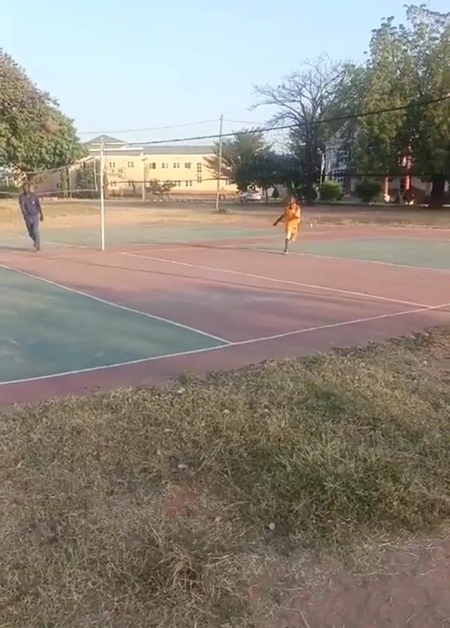 man and a boy playing volleyball on a green and red court. The boy is wearing an orange shirt. The man is wearing a long-sleeved shirt and dark pants. They are passing the ball back and forth over the net. The court is surrounded by grass. In the background there is a building and several trees under a clear blue sky. The camera is positioned close to the ground.