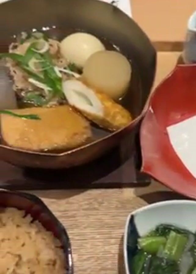 Japanese meal set arranged on a wooden tray. The main dish appears to be Oden, served in a metal pot. It contains ingredients like eggs, fish cakes, and other ingredients in broth. Next to the Oden is a red bowl with a white piece of paper inside, and a small blue and white dish containing vegetables, possibly some type of salad or pickled greens. There is also a tiny dish containing what looks like pickles. A small bowl of cooked rice sits on the tray as well. The setting seems to be in a restaurant.
