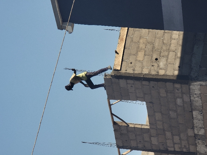 The image depicts a construction site under a clear, light blue sky in Maiburiji, Nigeria
