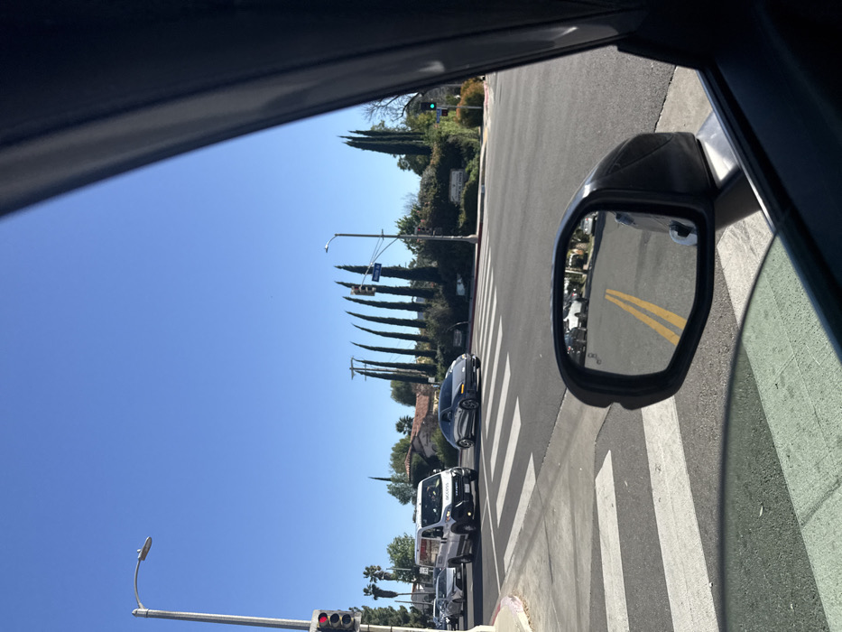 View from inside a car, looking out the driver's side window. A side mirror reflects a road with yellow double lines. Outside, a street with crosswalks has several vehicles stopped. Tall, thin trees line the street, with a traffic light visible in the distance. The sky is clear blue.