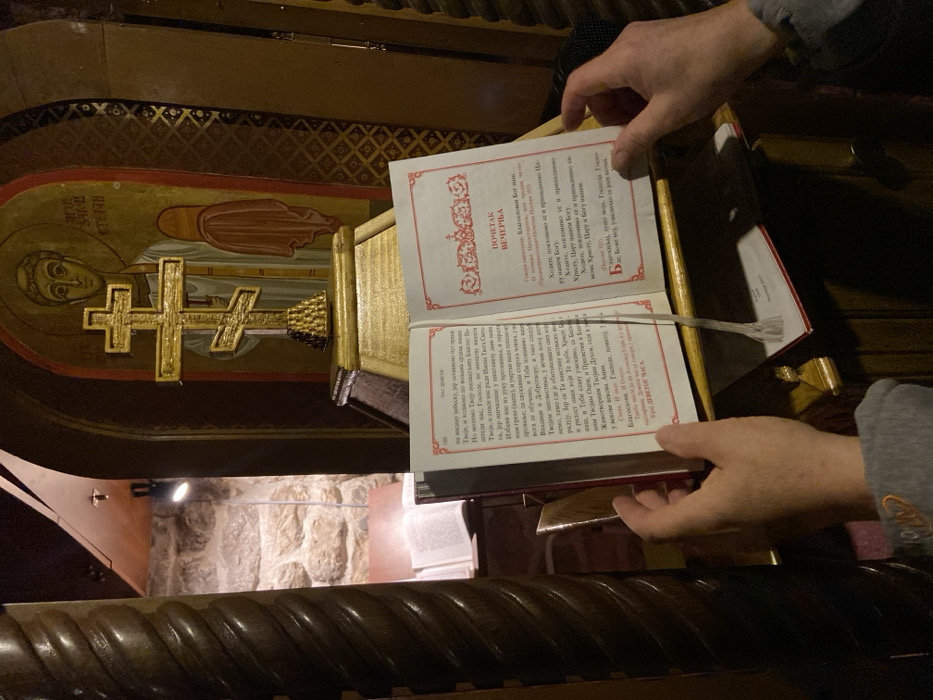 An individual's hands are observed holding an open religious book, displaying text in Cyrillic script on both pages, within a religious structure in Zagrađe, Montenegro