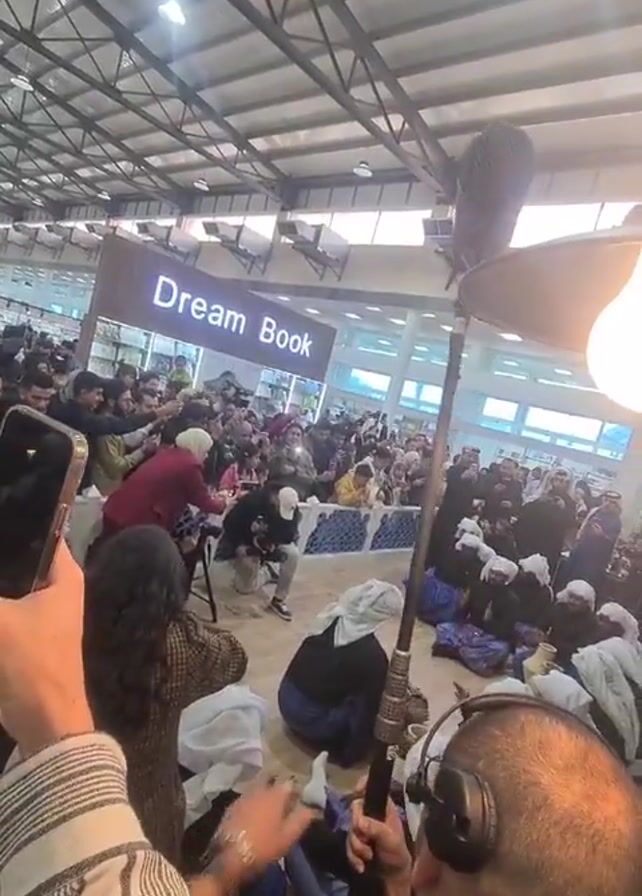 The scene captures a gathering of people in what appears to be a large, open indoor space with a high ceiling revealing industrial support beams and ventilation systems. A sign that reads "Dream Book" is illuminated at the back of the crowd. Many individuals are seen sitting on the floor, some wearing white head coverings, while others stand around observing. A person wearing headphones is in the foreground, holding a microphone boom. Several people are using mobile phones to take pictures or videos. A warm-toned light illuminates the foreground. There appears to be some event or performance taking place in the center of the group. The environment suggests a public space or a large hall.