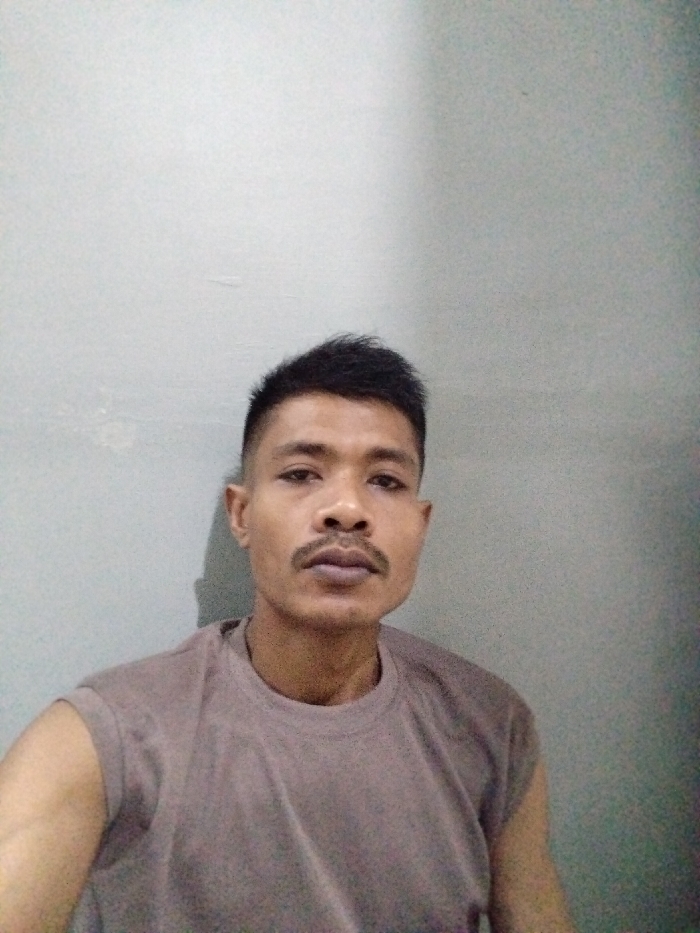 A male individual is depicted in a medium-shot portrait against a plain, light gray wall. The subject is an adult male with short, dark hair styled with a slight fade on the sides and a fuller top. He has a dark, thin mustache and dark eyebrows. His eyes are dark, and his expression is neutral, with his gaze directed forward, towards the camera. He is wearing a crew-neck, short-sleeved t-shirt in a muted brown or grayish-brown color. A faint shadow is cast on the wall behind the subject, slightly to the viewer's right. The scene is located in Kutaglumpang, Indonesia.