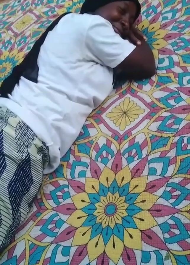 . A woman with dark skin and wearing a black head covering, white t-shirt, and patterned pants is lying on a colorful blanket with a mandala pattern. She is lying on her side with her hands near her face, seemingly asleep. The blanket is on the ground in an outdoor setting. There is a sandy area visible at the edges of the blanket.