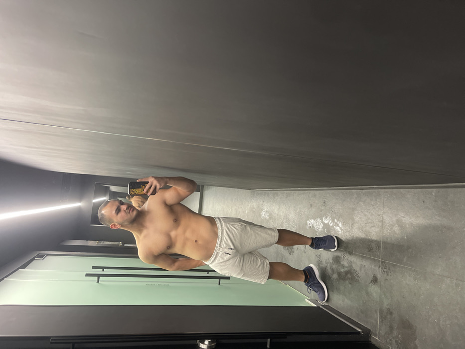 - "An adult male, shirtless and wearing light grey athletic shorts with dark blue athletic shoes, is depicted taking a mirror selfie in an indoor setting" by FM-6IM2j2, licensed under CC BY 4.0