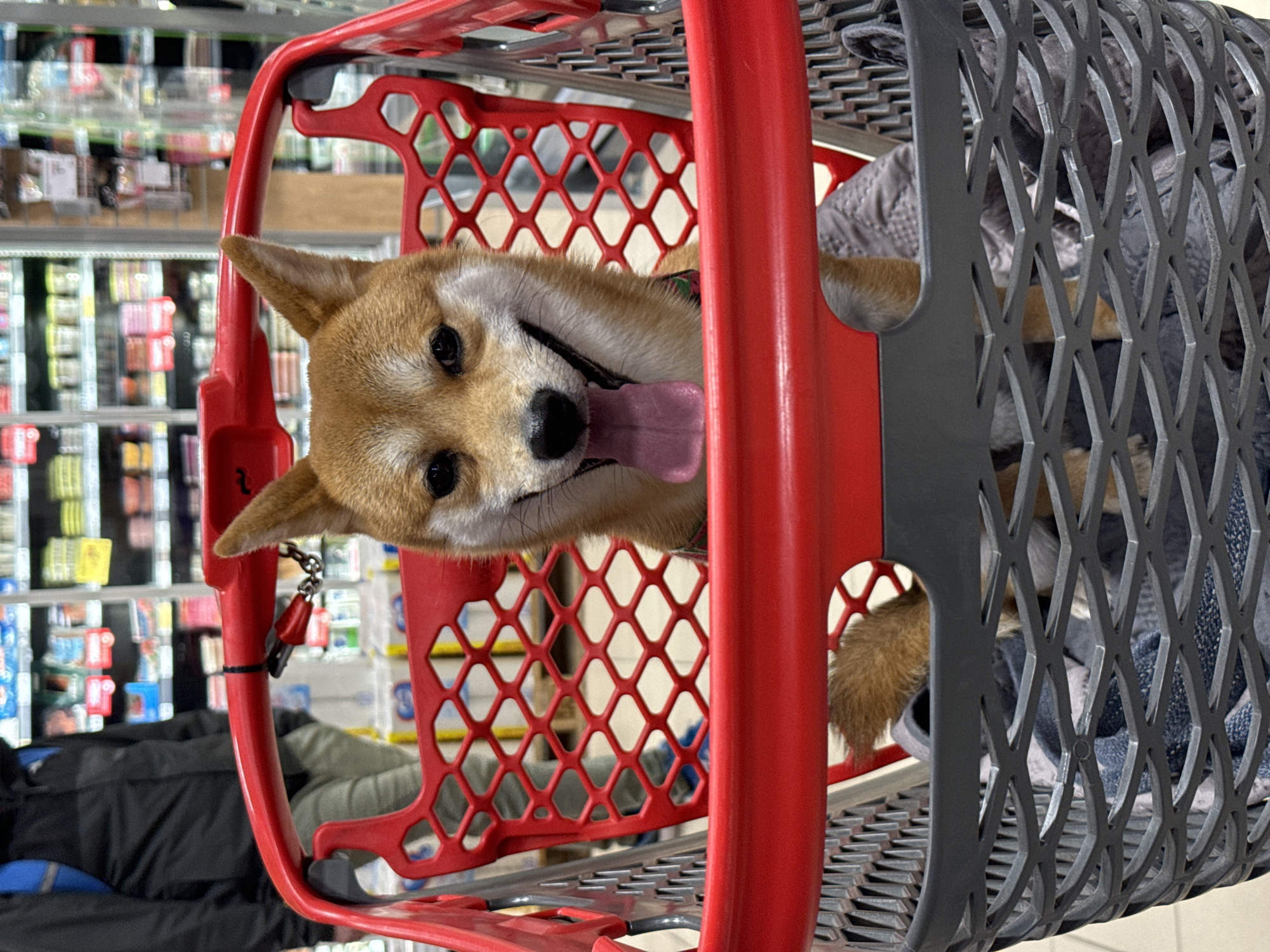 A Shiba Inu dog sits in the top basket of a red and gray shopping cart. The dog faces the viewer with its tongue hanging out. The cart is in a store with aisles visible in the background. One person, likely the dog's owner, is standing in front of the cart. The location is likely a shop somewhere in Carnikava, Latvia.