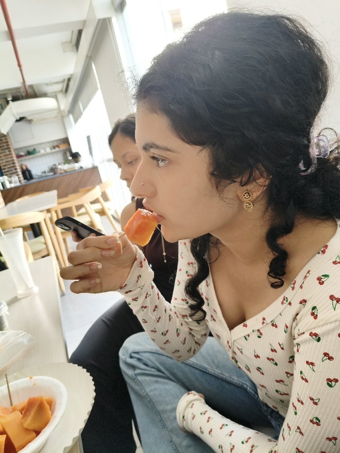- "A young woman is depicted in a medium shot, seated indoors, actively eating a piece of orange fruit, likely papaya, from a wooden skewer" by FM-Urddm2, licensed under CC BY 4.0