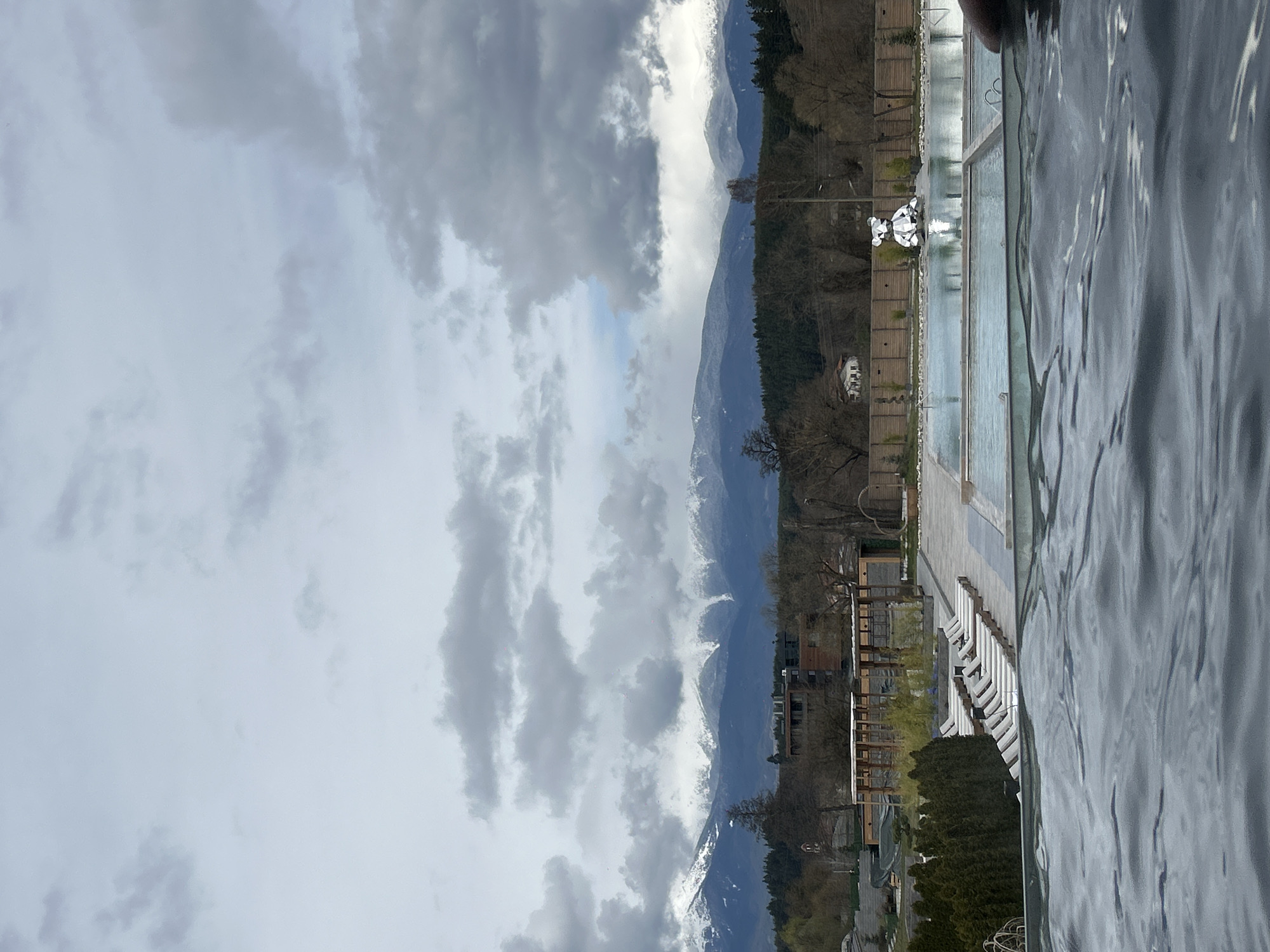 View overlooking thermal mineral pools in Bania, Bulgaria. The shot includes the pool edge, water, resort furniture, landscaping, and the Rila mountains. Overcast sky.
