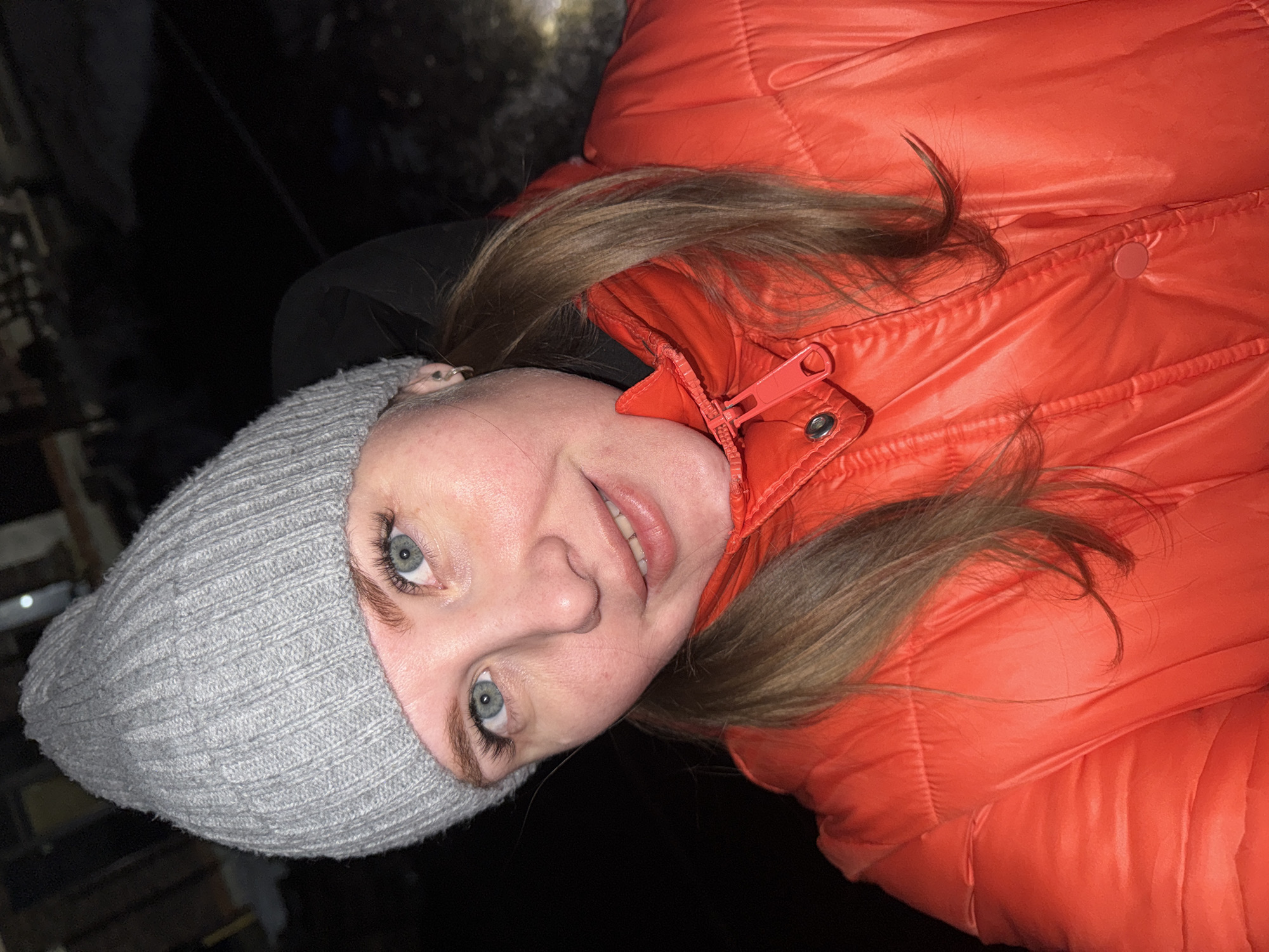 A woman with light skin, wearing a gray beanie and a bright orange puffer jacket, is visible in this close-up, slightly tilted photograph