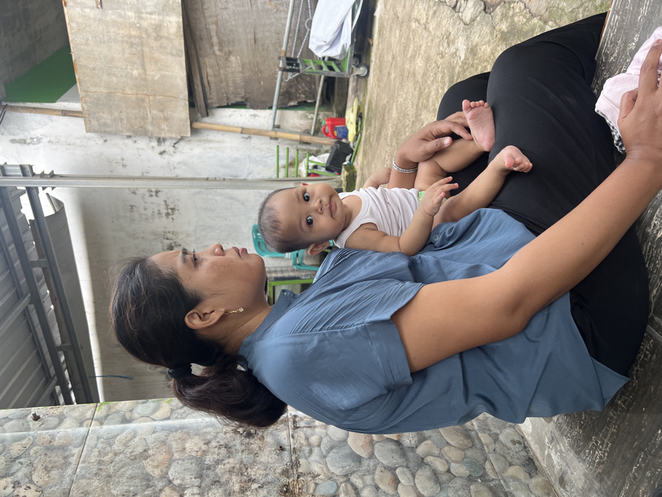 In Wedarijaksa, Indonesia, an adult female with dark hair pulled into a low ponytail, wearing a light blue short-sleeved collared shirt and black trousers, is seated. A gold-colored dangle earring is visible in her left ear. She looks off-camera to the right with a neutral expression. On her lap, an infant sits upright, facing the camera with dark eyes and a neutral expression, wearing a white sleeveless undershirt and a green-accented diaper. A silver-colored bracelet adorns the infant's right wrist. The woman's hands support the infant, and her right hand rests on a light-colored cloth on her lap. They are situated outdoors or in a semi-enclosed area, seated on a dark-colored bench or low platform. The immediate background to the left features a wall constructed from embedded rounded stones or pebbles. To the right, a weathered light-colored concrete wall is visible, beneath a corrugated metal roof structure supported by metal beams. Further into the background, a partial green wall section, bamboo poles, a red container, and a metal utility cart partially covered by a white sheet are present. The ground visible behind the figures is light-colored concrete.