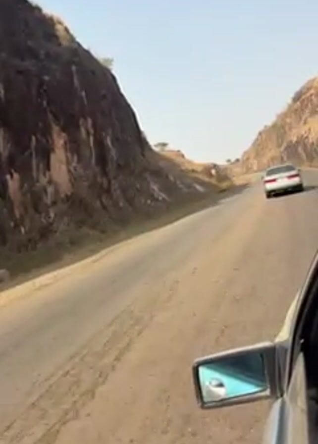 car journey along an asphalt road winding between rocky hills under a clear sky. Another car is visible ahead on the road. The side mirror of the filming vehicle is visible in the foreground. The environment appears dry, with sparse vegetation on the hills. The road shows signs of wear and tear. There are no people visible outside of the cars.