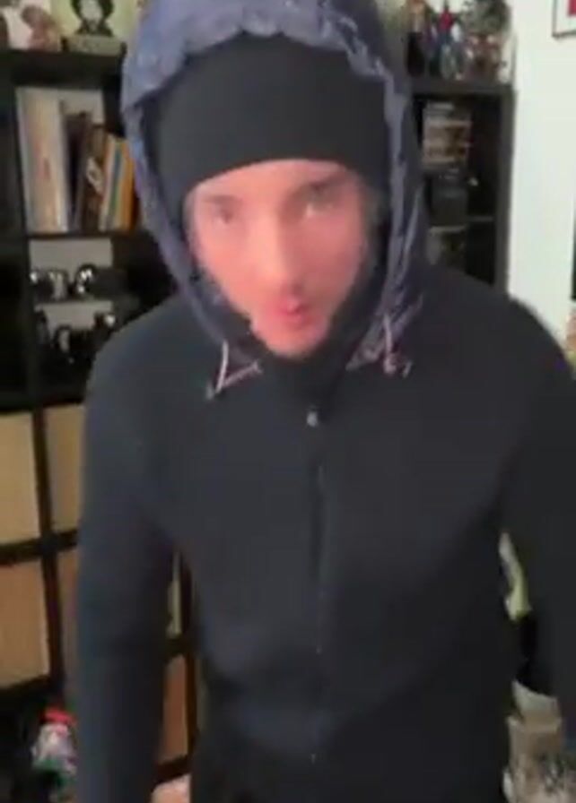A young, slender man wearing a black beanie and a black zip-up hoodie with the hood up, then a light blue nylon hood over that, looks at the camera. He is wearing black sweatpants. The camera is at eye-level, and is positioned in front of him. The background includes a large dark shelf with books and knick-knacks, framed photographs on the wall above the shelf, and a patterned rug on the floor. The man says in French, “Je t’enlève, j’enlève tout,” which translates to "I'm taking you off, I'm taking everything off."