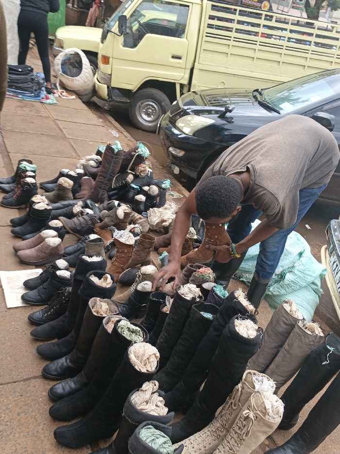 The scene depicts an outdoor street market in Thika Township ward, Kenya, observed during daylight hours. Approximately seventy to eighty pairs of boots of various styles, colors (primarily black, brown, and beige), and heights (ankle to knee-high) are displayed on a reddish-brown paved sidewalk. Many of these boots contain light-colored fabric or paper inserts. A male individual, with short, dark hair, wearing a brown short-sleeved shirt, blue jeans, and a green and yellow bracelet on his right wrist, is centrally positioned. He is bent forward, actively examining or arranging a light brown ankle boot with both hands. To his immediate right, a light green sack rests on the ground beside the boots. Adjacent to the sidewalk, a dark-colored sedan is partially visible, parked on an asphalt street where a puddle of water is present. Further down the street, a light yellow pickup truck with a slatted cargo bed is parked. In the upper left background, the lower torso and legs of a second individual, wearing black pants, are visible standing near stacks of folded clothing and a large white sack. Indistinct urban buildings form the distant background.