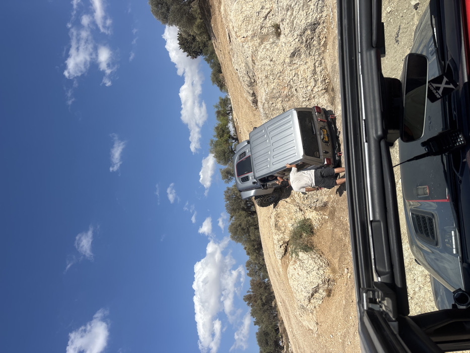 The image captures an off-road scene in the natural, hilly terrain in the vicinity of Hadid, Israel, under a clear blue sky with scattered white cumulus clouds. In the midground, a silver/light grey modified off-road vehicle, consistent with a Mercedes-Benz G-Wagen, is positioned at an acute angle on a steep, rocky dirt path, appearing to ascend or descend the incline. Its rear faces the viewer, displaying a rear-mounted spare tire, red recovery shackles on the bumper, and an Israeli license plate (89-598-XX). A male individual, wearing a white short-sleeved t-shirt and dark shorts, stands behind the vehicle's rear driver's side, observing its maneuver. The surrounding environment consists of light-colored rocks, dry earth, and sparse green vegetation, with numerous trees dotting the rolling hillsides. The foreground reveals the interior dashboard and windshield frame of another off-road vehicle, likely a Jeep Wrangler, from which the photograph was taken. Visible elements include a black two-way radio with an antenna on the right side of the dash, a rearview mirror with a dangling black 'AREON X' air freshener, and a portion of the dark grey hood of the foreground vehicle, featuring a red stripe and functional vents.