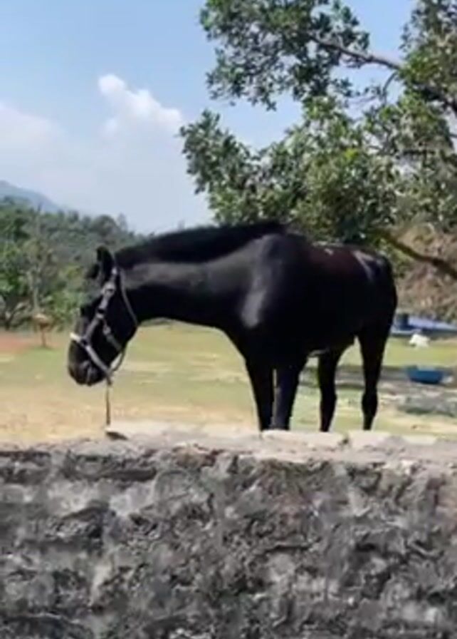 black horse standing in a grassy field, partially obscured by a low stone wall. The horse is wearing a halter and lead rope. There are trees and hills in the background, and the sky is blue with some clouds. The horse occasionally looks up, but mainly seems to graze.