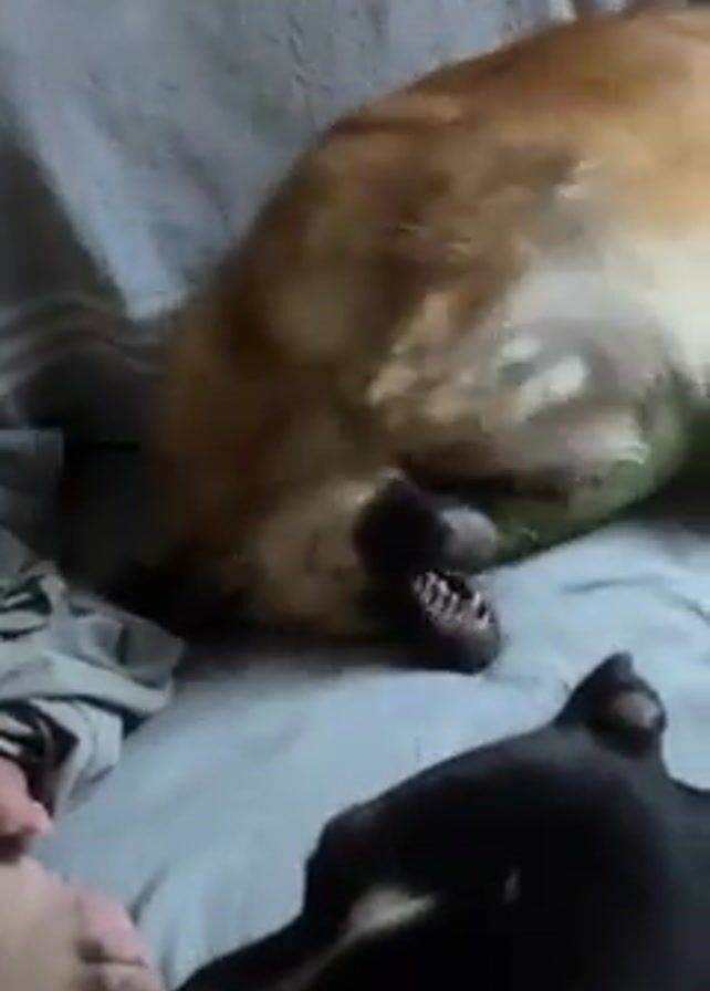 A tan and white dog is sniffing and licking a person's bare foot on a gray blanket. A black dog is also nearby. The person is wearing a pink sleeve. The tan and white dog is interacting with both the foot and some gray fabric.