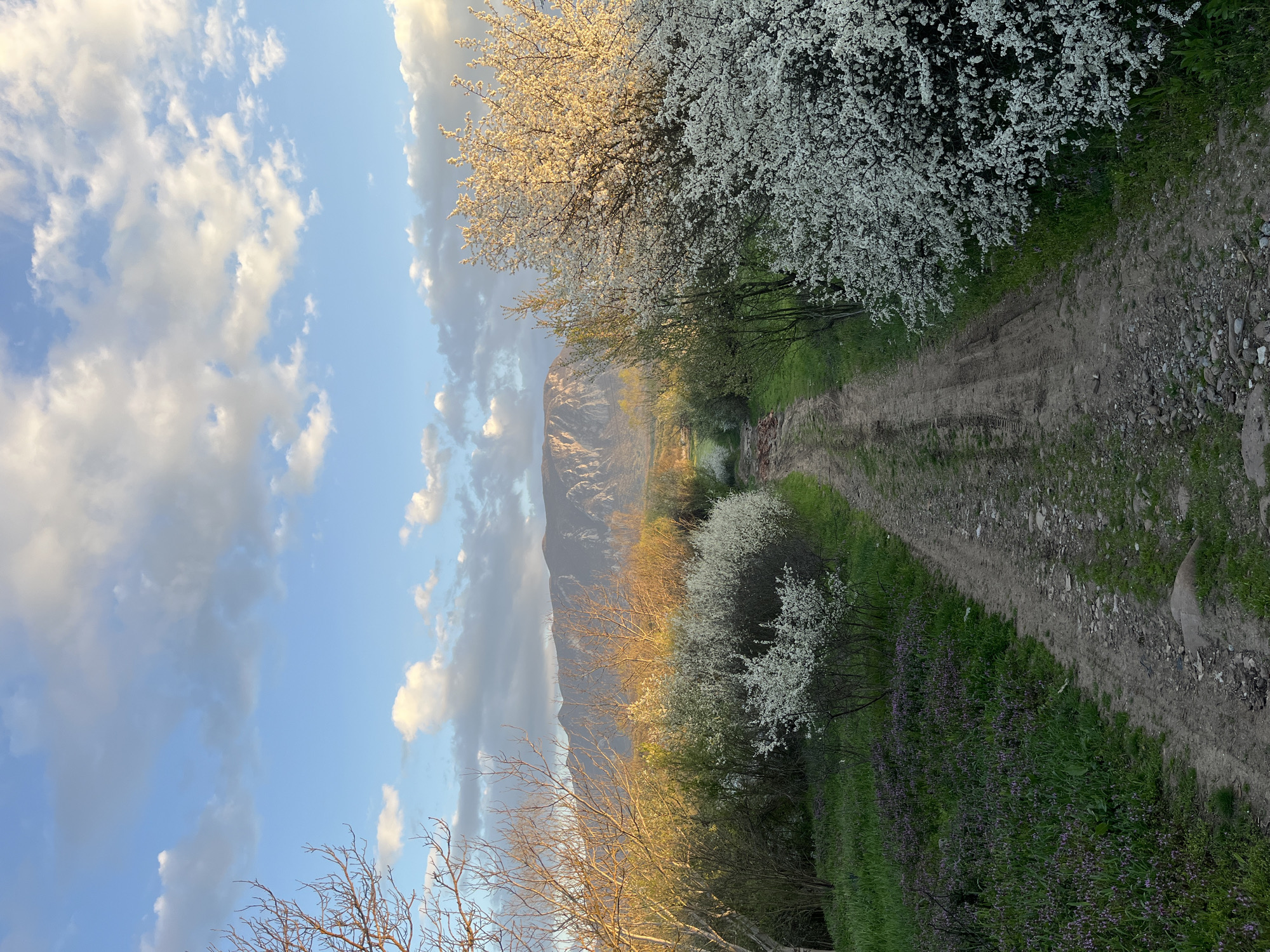 dirt path leading into a landscape with flowering trees and a mountain in the background. The sky is blue with scattered clouds. The foreground contains grass and purple wildflowers. Trees with white blossoms line the path. Bare trees are also visible. The mountain appears to be near the town of Pudria, Bulgaria.