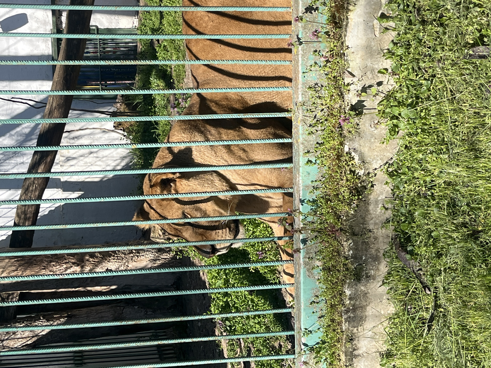 lion in an enclosure, likely at a zoo or animal park. The lion is brown and partially visible behind green metal bars of the enclosure. A wooden beam is positioned behind the bars. Outside the enclosure, there is a concrete structure with various plants and grass growing nearby. The presence of a lion in a cage suggests a controlled environment for animal conservation or exhibition. The photo was taken in Razgrad, Bulgaria.