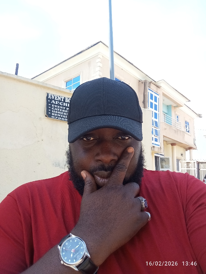 A dark-skinned male subject is centrally positioned in a medium close-up, looking directly at the camera under bright daylight. He wears a black baseball cap, a red short-sleeved t-shirt, a silver-cased watch with a black leather strap on his left wrist, and multiple rings on his fingers. A full beard and mustache are visible. His right hand is raised, with the index finger touching his chin or lower lip. In the background, to the subject's left, is a cream-colored wall featuring a black rectangular sign. The sign displays "EVENT BOK," partially visible text "AF CHI," followed by a list of services: "EVENT PLANNERS," "CATERERS," "USHERS," and "RENTAL," along with a partially visible Nigerian phone number beginning "07060." To the subject's right and behind him stands a multi-story building with a light-colored facade, blue-tinted windows, and balconies with metal railings. A tall, slender grey pole extends vertically into the sky behind the subject's head. The scene is consistent with an urban area in Jos, Nigeria, likely near a commercial or mixed-use street. The image is timestamped "16/02/2026 13:46".