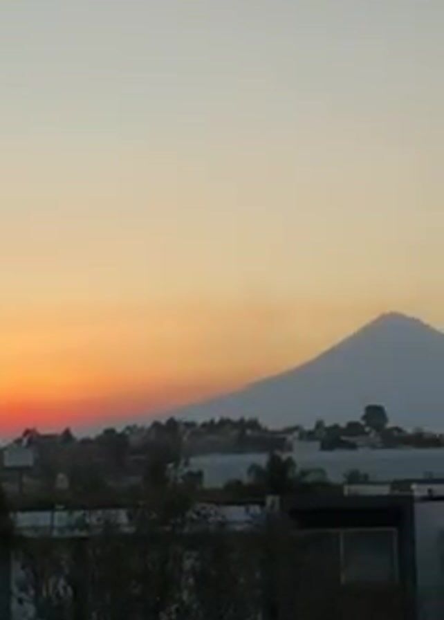 view of a mountain range behind some buildings at dusk. The sky is a gradient of yellow and orange at the horizon, fading to a lighter color above. Silhouetted palm trees and buildings are in the foreground. The mountains appear to be distant.