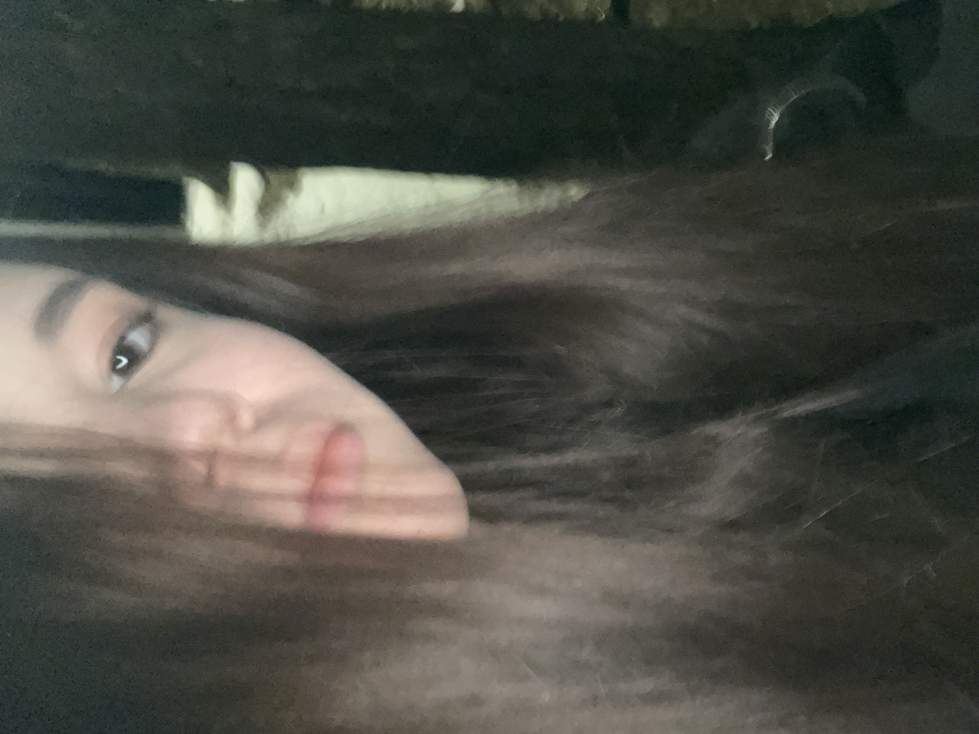 The image displays a dimly lit, close-up portrait of an individual, identified as being in Chaikovsky, Russia. The subject, likely female, has long, dark brown hair that covers the majority of the left side of the face. The visible features include the right eye with a brown iris, a prominent dark eyebrow, and a small, crescent-shaped light reflection. The visible portion of the nose and light pink lips are also present. The individual is looking directly into the camera. The background is dark, indicative of a low-light or nocturnal setting. A dark, vertical element, possibly a tree trunk, is visible on the right side of the frame, with an indistinct lighter, yellowish-white area positioned further back. The subject is wearing dark-colored clothing, visible on the lower right.