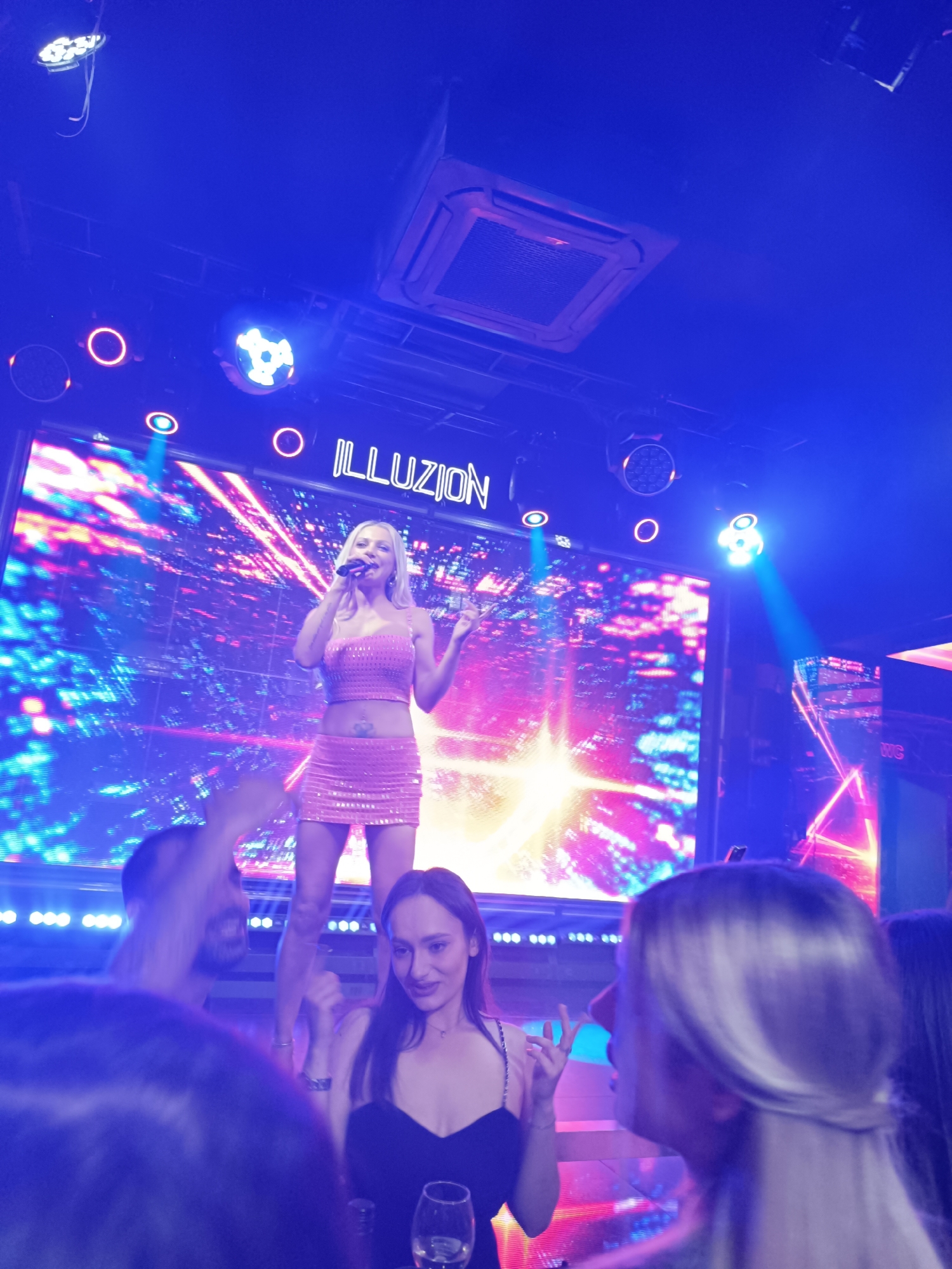 The image depicts a live performance inside the "ILLUZION" nightclub in Sofia, Bulgaria. A blonde female performer, dressed in a two-piece pink sequined top and skirt, stands center-stage on an elevated platform, holding a microphone in her right hand and gesturing with her left. Her midriff is exposed, revealing a tattoo. Behind her, a large LED screen displays abstract, colorful graphics in blue, pink, and white, with the venue name "ILLUZION" prominently displayed in white capital letters at the top right. Multiple stage lights and an overhead air conditioning unit are visible on the ceiling above the stage, casting blue and white light. In the foreground and midground, an audience is partially visible, looking towards the stage. A dark-haired man with a beard is seen smiling with a raised arm to the left of the stage. To his right, a woman with long dark hair, wearing a black strapless top, holds a stemmed glass and appears to be observing the performance. Another blonde woman is visible in profile on the right side of the frame. The overall environment is characterized by dim interior lighting, heavily influenced by the blue and magenta hues from the stage and screen illumination.