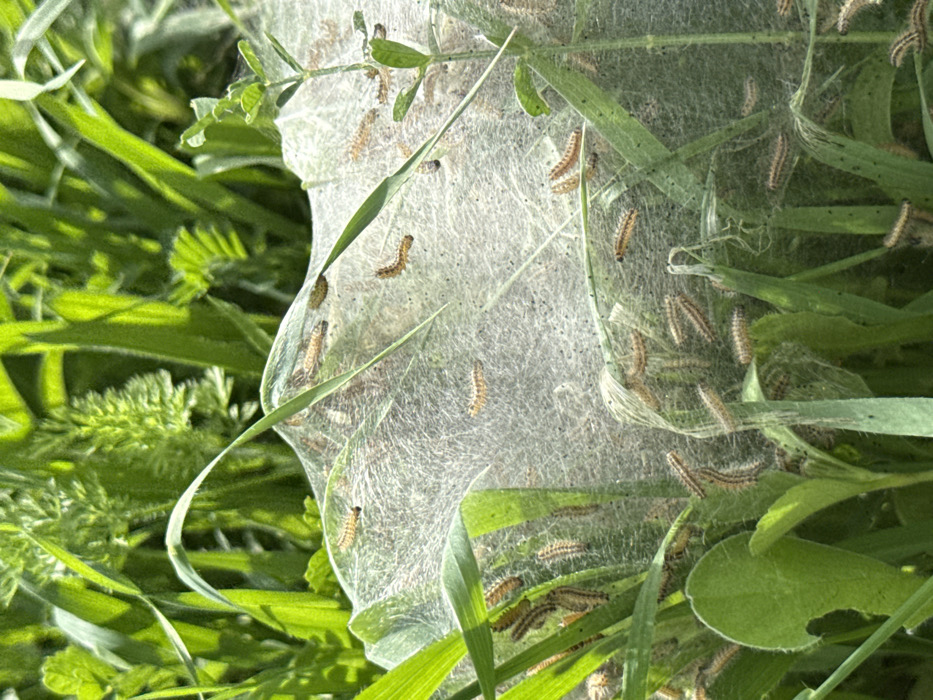 - "The image displays a close-up view of a natural outdoor scene featuring a dense, white, translucent silken web enveloping multiple green herbaceous plants" by FM-XR4443, licensed under CC BY 4.0