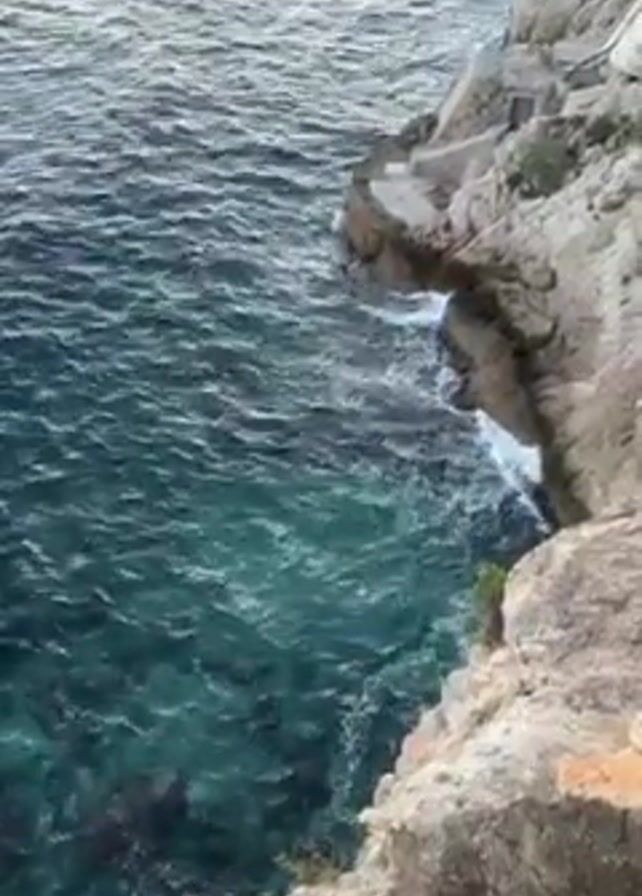 The camera, likely handheld, films the coastline of a city from an elevated vantage point on a cliff. The scene starts with a close-up view of the turquoise water crashing against the rocky cliffside. The camera pans up to reveal a wider view of the coastline, including a small harbor with a red structure at its entrance, along with buildings situated along the cliffside. The sky transitions from a bright, overcast look near the horizon to a clear, light blue with scattered clouds overhead. The overall light suggests the time is likely early morning or late afternoon.