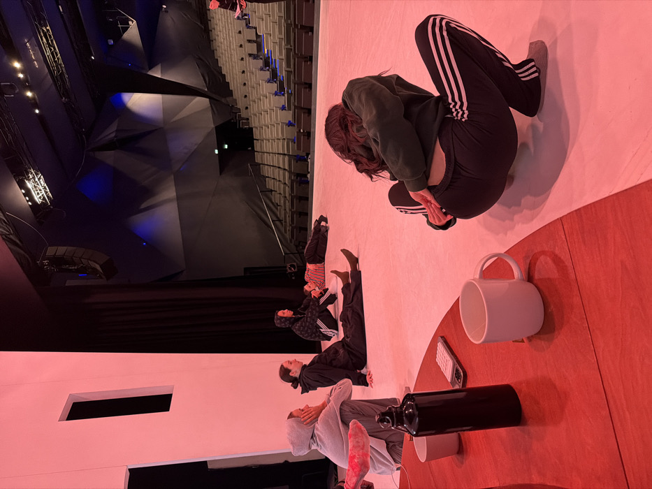 The scene depicts a modern theatre stage, identified as La Scala Paris, France. The stage floor is bathed in a strong red light. Six individuals, appearing to be young adults, are present on the stage. In the immediate foreground, a person with dark hair, wearing a dark green sweatshirt and black Adidas track pants, is in a deep squat, facing away from the camera. Further back on the stage, four other individuals are seated or lying down; one wears a grey hooded sweatshirt, another black athletic wear, one a black hooded top and black Adidas track pants, and a fourth is lying prone in a red and white striped top. A sixth individual is partially visible standing on the far right. In the bottom left foreground, a segment of a red wooden table holds a black water bottle, a white ceramic mug, a smaller light-colored cup, and a smartphone displaying a calculator app. The background reveals rows of empty, dark grey theatre seating, backed by dark, angular, geometric acoustic wall panels. Stage lighting equipment and speakers are suspended above the auditorium seating area.