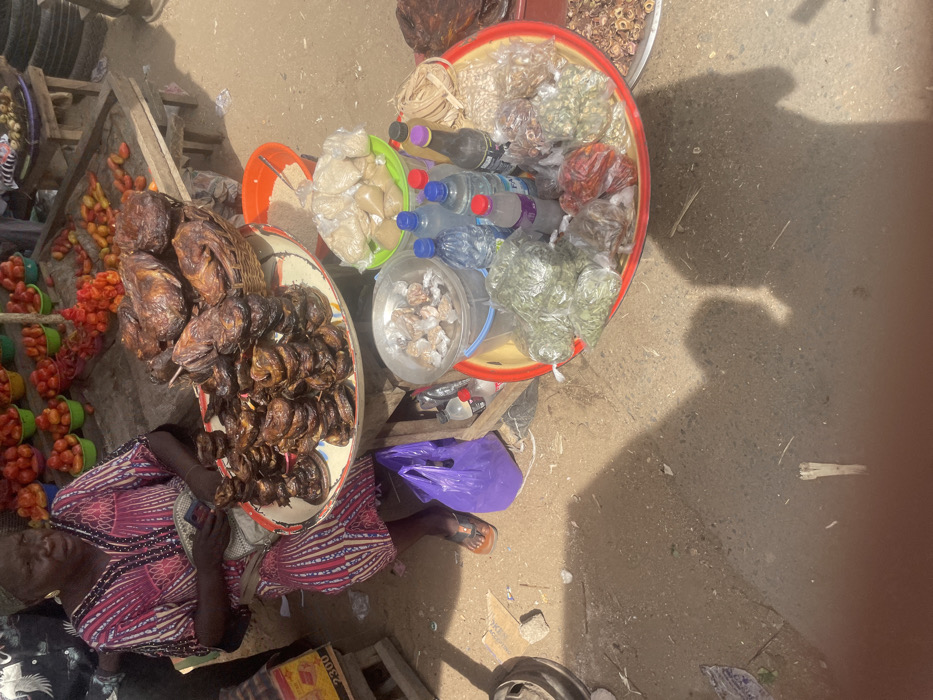 The image depicts an outdoor market scene in Numan, Nigeria, viewed from a slightly elevated perspective. In the left foreground, an adult female with dark skin and a light-colored head covering is seated. She wears a long, patterned dress in shades of pink, purple, white, and black. Her left hand holds a small, light-colored object, possibly a mobile phone. Her feet are visible, clad in brown sandals. To her immediate right, a large, round, silver-colored metal tray holds numerous stacks of dark, smoked or dried fish, arranged in columns. Behind this, another round basket or tray contains additional dark fish. Above and behind the seated woman, a wooden market stall displays various fresh produce. Multiple green plastic bowls are filled with bright red tomatoes, and other bowls contain red peppers. To the right of the central display of fish, and extending into the lower right foreground, a large, round red plastic tray rests on the unpaved, light brown earthen ground. This tray holds an assortment of goods packaged in clear plastic bags, including green leafy substances (possibly herbs or vegetables), small pale seeds or grains, and red chili peppers. Several plastic bottles of water with blue or red caps, along with bottles containing darker liquids, are also present on this tray. A white plastic bucket containing pale, irregular items and a small orange bowl with a granular substance are located next to the red tray. On the ground between the seated woman and the goods on the lower right, a purple plastic bag is visible. The unpaved ground features scattered debris and strong, dark shadows. In the upper left corner, the arm and partial torso of another individual, wearing a patterned garment, are visible. The overall environment suggests a bustling commercial market.
