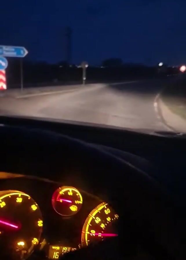 The view from inside a car driving on a dark, rural road at night. The dashboard is illuminated with yellow and red lights, and the speedometer shows the car is accelerating. A stop sign is visible on the side of the road. The sky is dark blue.