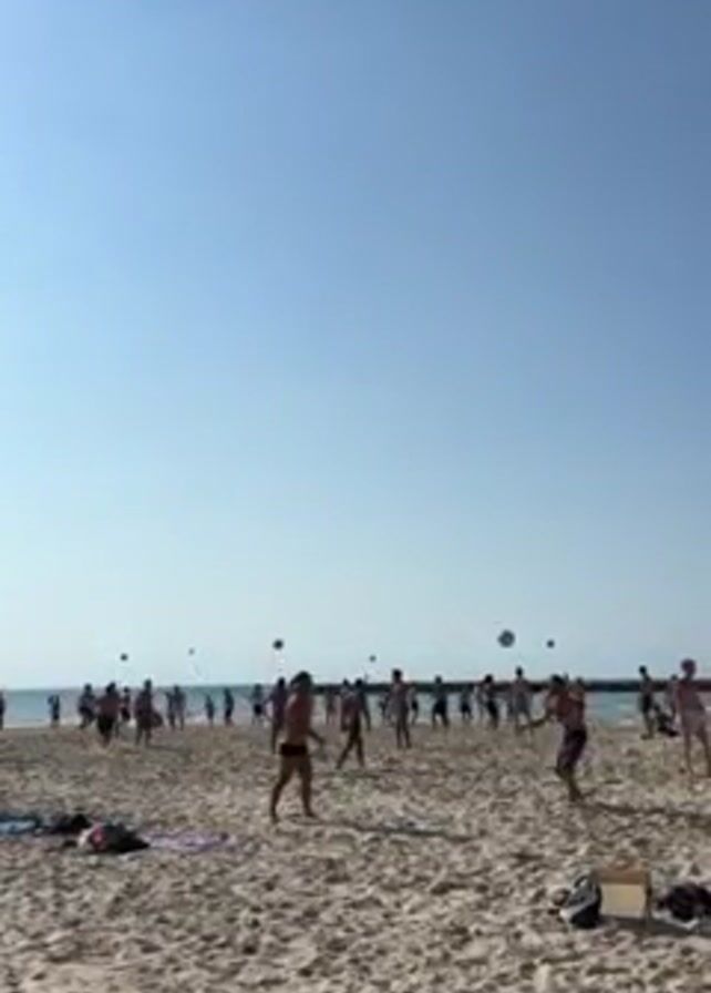 A wide shot shows a large group of shirtless people playing a game on a beach. They are spread out across the sandy beach in front of the ocean on a sunny day under a bright blue sky. The game involves throwing and kicking a ball. Some beach towels and bags are scattered on the sand in the foreground.