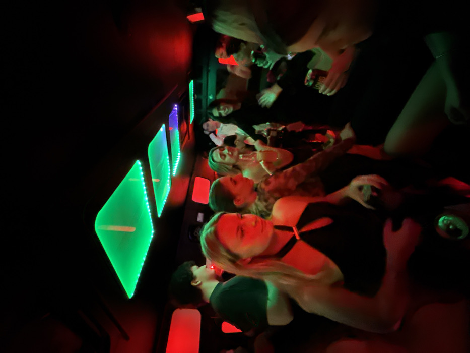 A group of people are shown inside a dark, illuminated vehicle. The vehicle has a bar area lit with green neon accents, contrasting with red and blue lighting. The individuals are holding drinks, potentially cans, and appear to be enjoying themselves. The scene appears to be a mobile party, with the dark environment enhancing the vibrant neon lights.