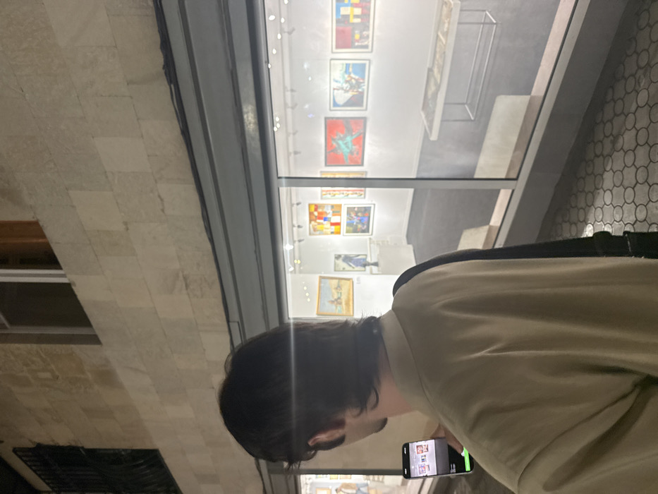 The image depicts a nighttime scene outside an art gallery in Yerevan, Armenia. A single individual is visible in the foreground, seen from the back and right side, with dark, medium-length hair and wearing a light-colored collared shirt. This person holds a black smartphone in their right hand, angled towards the gallery's display window, actively capturing what appears to be an image or video, as indicated by the content on the phone screen. A dark strap of a bag is visible over their right shoulder. The art gallery occupies the ground floor of a building constructed with light-colored, rectangular stone blocks. A dark grey horizontal band runs above the large, clear display window of the gallery. On the upper left, a window with a dark metal security grate is set into the stone facade, with another plain window partially visible to its right. Inside the brightly lit gallery, numerous artworks are displayed on white walls. Visible paintings include a landscape piece with warm tones, a depiction of a figure in blue, and several abstract works, one prominently featuring red, blue, and yellow geometric shapes, and another with a jagged red and green motif. Towards the bottom right of the gallery window, a long, low display table with a metal frame and light-colored top surface holds indistinct objects, possibly additional art pieces. The gallery floor appears dark. The sidewalk outside features a patterned paving of interlocking circles or honeycomb-like tiles in shades of grey and white.